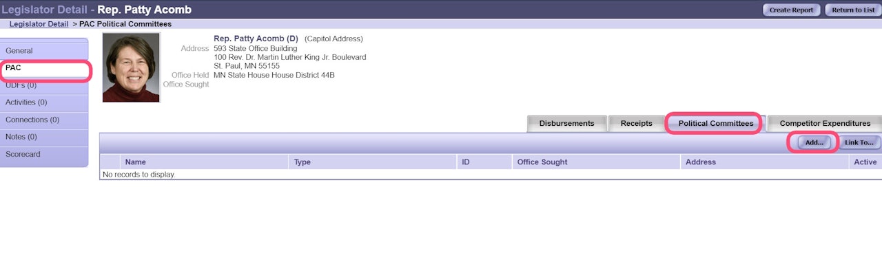 To add a State-Level Political Committee, search for the State-Level candidate/legislator and go to the Political Committees tab under their PAC section. On this section, click the Add button.
