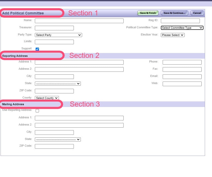 On this screen, you can enter the State-Level Political Committee Details. This information is disclosed on campaign finance reports.