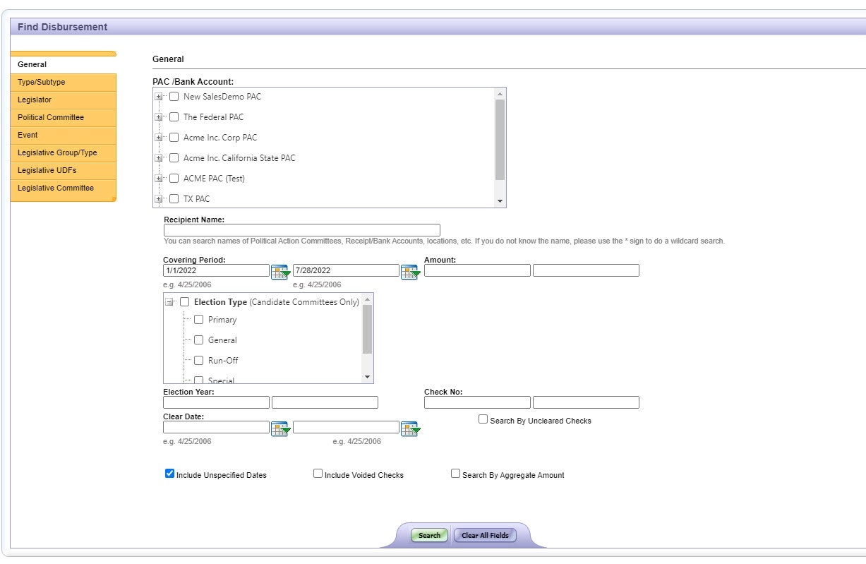 Clear Date: Allows you to search for disbursements marked cleared within a date range. This can be helpful when comparing the cleared checks on the monthly bank statement and Democracy Direct.