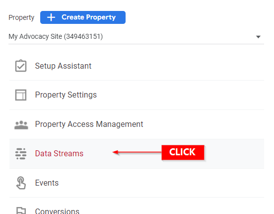 The left column of the dashboard shows you information about your Account, the second column contains options that control your individual web properties. Click on the Data Streams option.