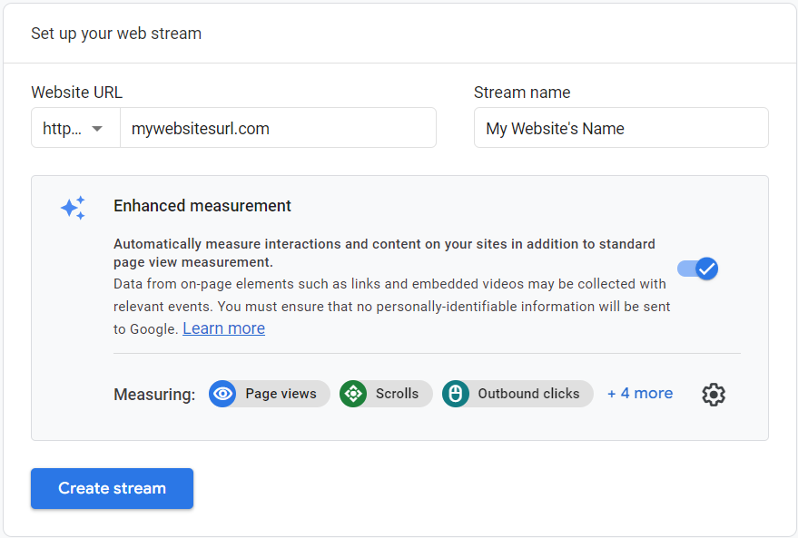 Provide the URL of your site without the https:// part in the Website URL field and provide the name of your site in the Stream name field.
