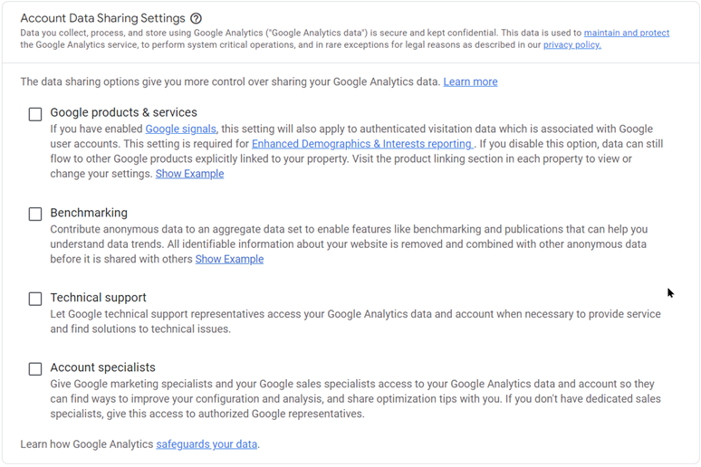 Scroll down and you will see your account’s data sharing settings. We recommend unchecking all of these.