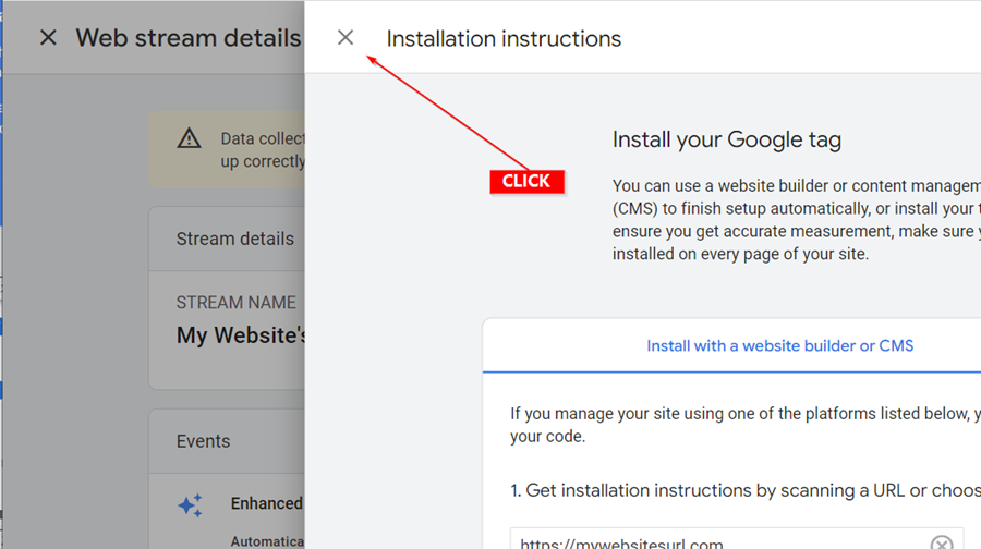 Google will then generate the details necessary to configure tracking on your website. You may be shown an Installation instructions slide like the one shown below. These instructions do not apply in our case.