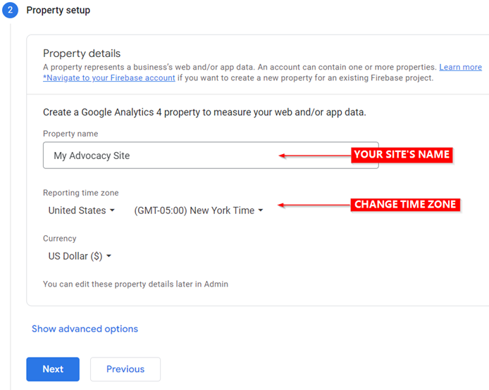 A new section will expand. Provide the name of your website in the Property name field and be sure to change the time zone setting accordingly.