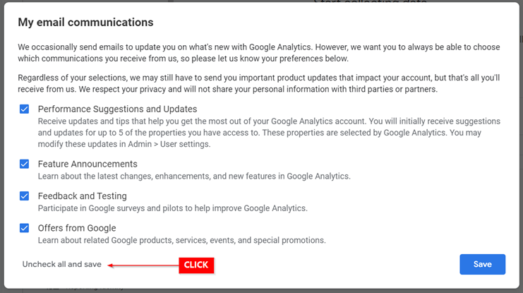 Another popup appears where you can set your email communication preferences. We recommend you click the Uncheck all and save button on this popup to proceed.