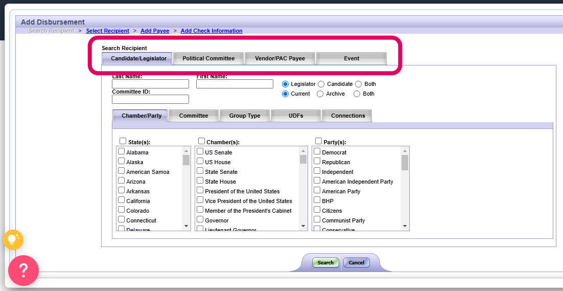 On this screen you will utilize the tabs shown here to find and select which legislator and/or the committee you are creating a disbursement for. Perform the search and select the corresponding entry on the results screen.
