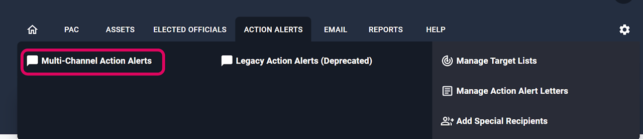 To create a new multi-channel action alert, navigate to the Multi-Channel Action Alerts menu and then select “Create New” from the Manage Multi-Channel alerts page.