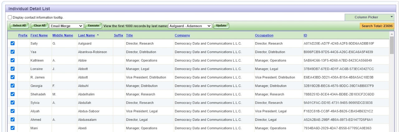Once a individual search has been performed, you will land at the results page. From this screen you can easily Export the results, update activities and perform grouping updates as well by selecting the drop down menu at the top left of the screen.
