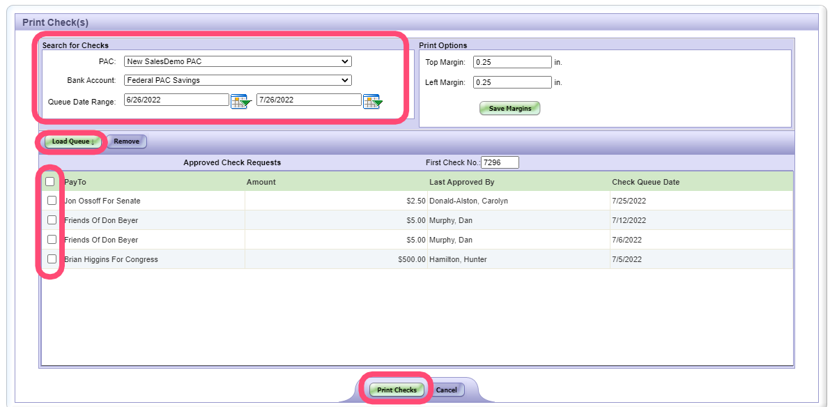 On this screen, you can search for the check(s) that you would like to print. Once you have entered the criteria, click Load Queue.