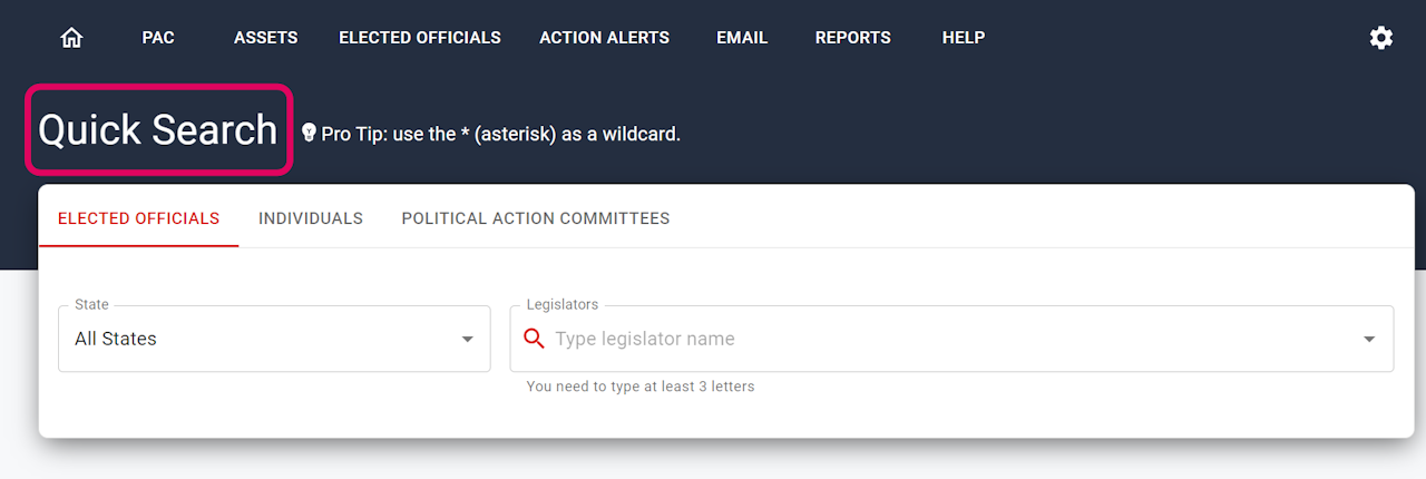 The Quick Search module allows you to quickly find individuals or legislators by name straight from the Democracy Direct home screen.