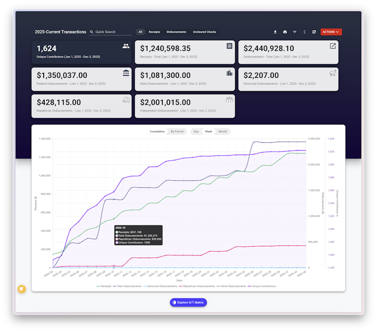 See every dollar in and out of your PAC — receipts, disbursements, and uncleared checks — in one easy-to-navigate, filterable, pivotable, and exportable screen.