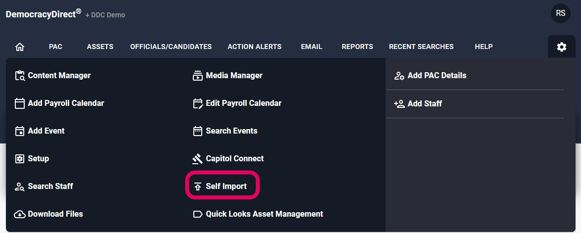 To access the tool, select the gears icon from the main menu and select Self Import.